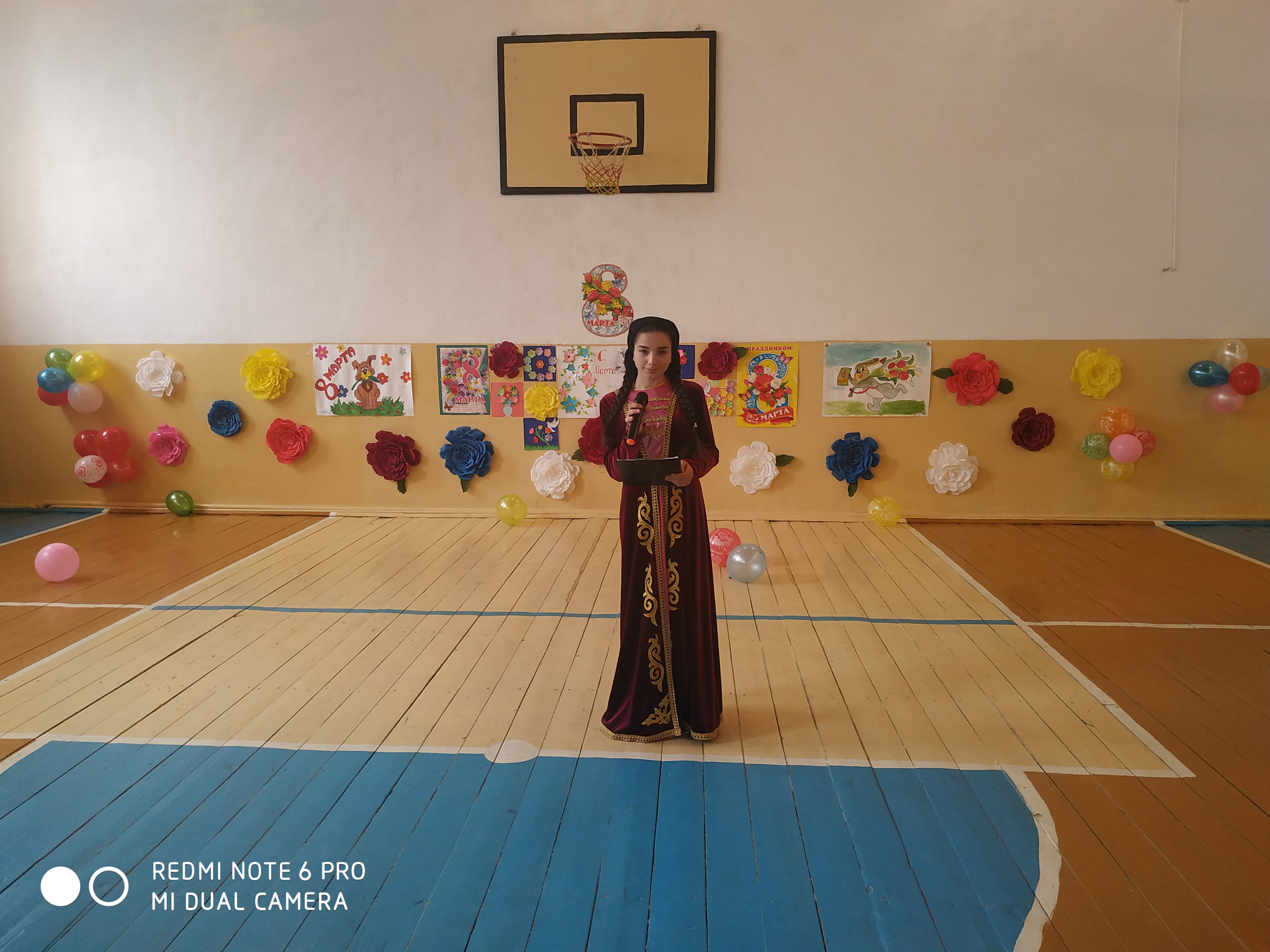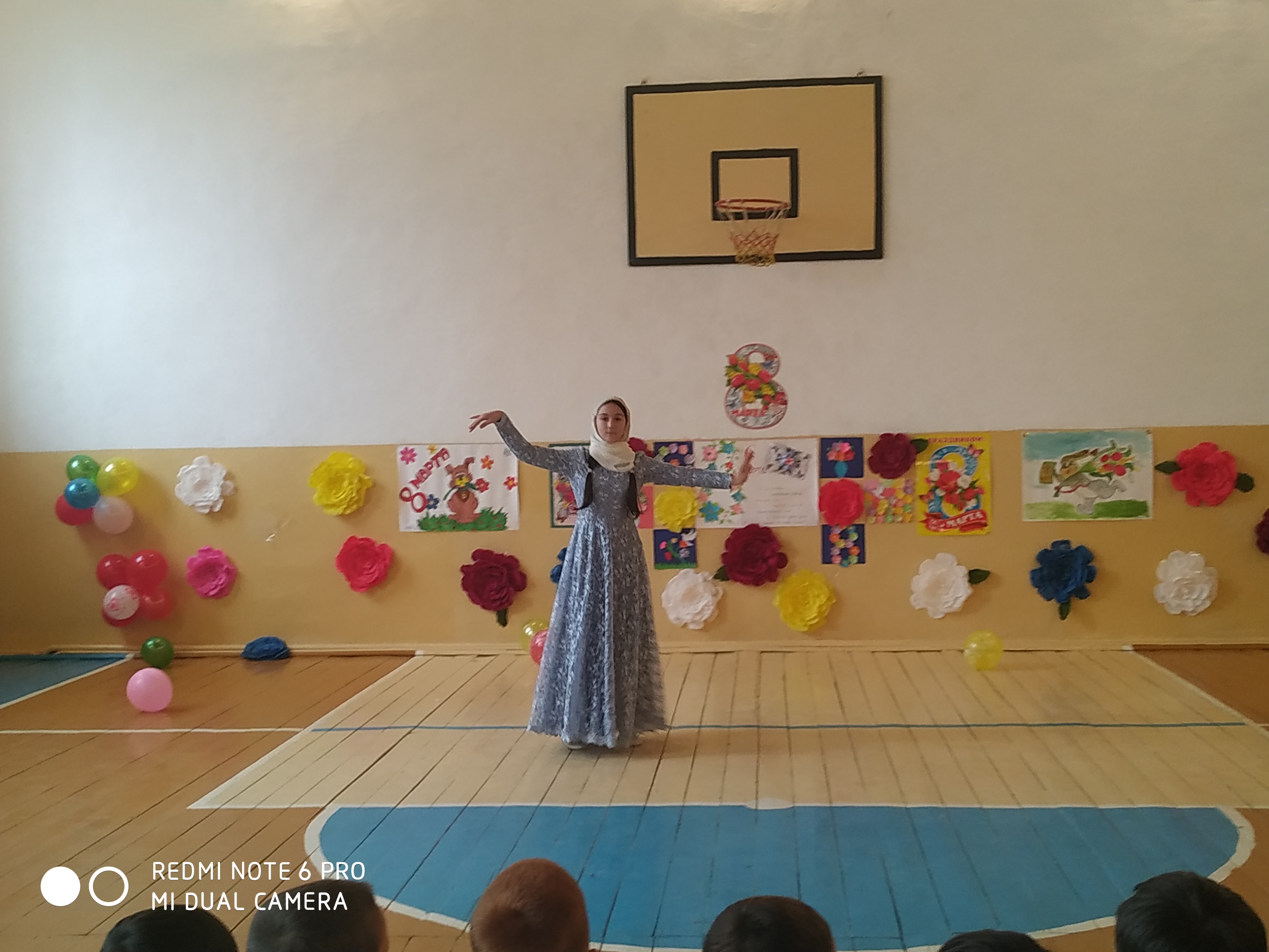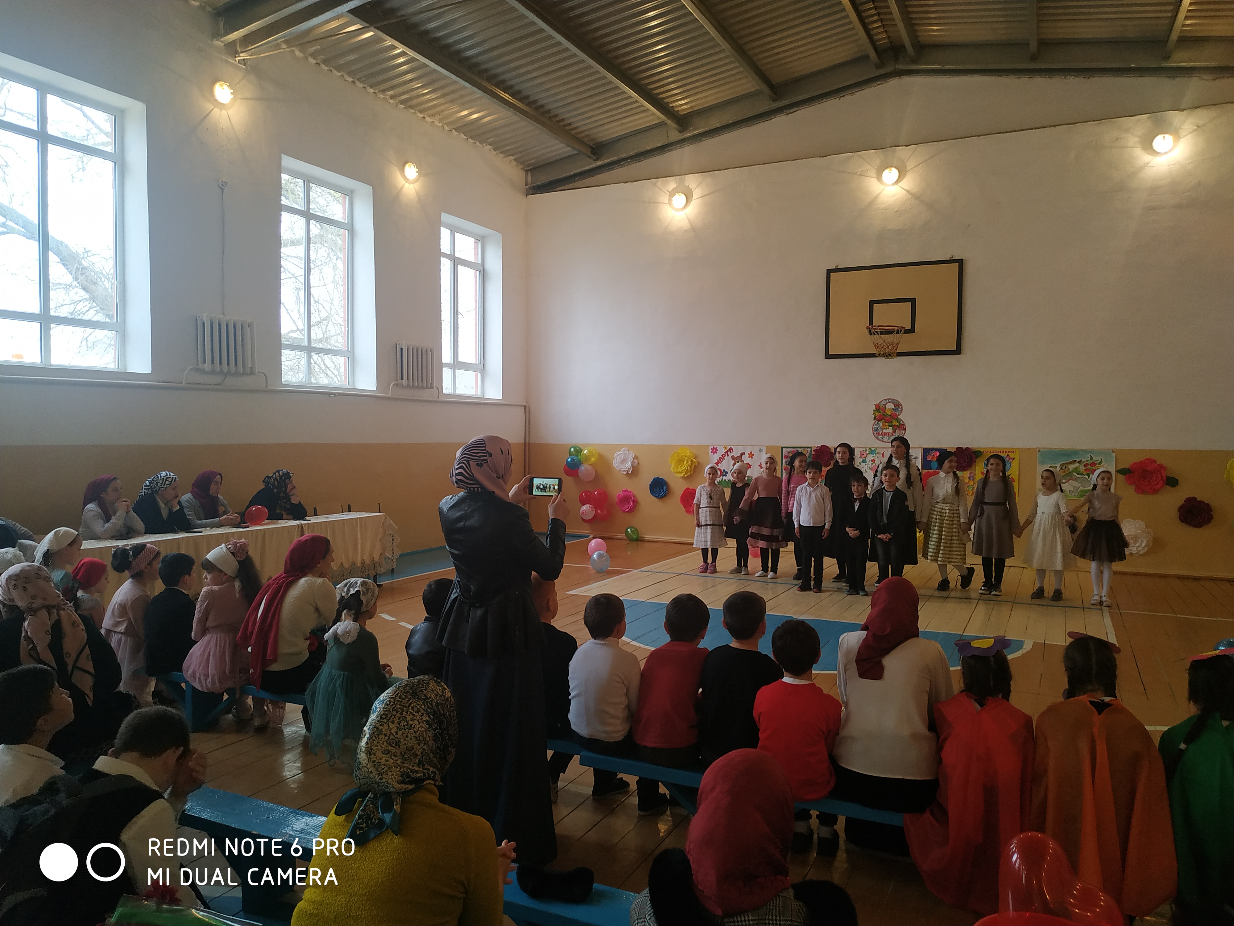 Мероприятие прошло в спортивном зале, в котором участвовали старшеклассники, учителя, администрация школы. Были приглашены матери обучающихся, которым было отведено почетное место в первом ряду, где их усадили, как самых дорогих и почитаемых гостей. В начале мероприятия перед присутствующими выступила заместитель директора по воспитательной работе Радуева М.Ш. Она поздравила всех с праздником 8 марта, пожелала всем присутствующим женщинам мира и долголетия.