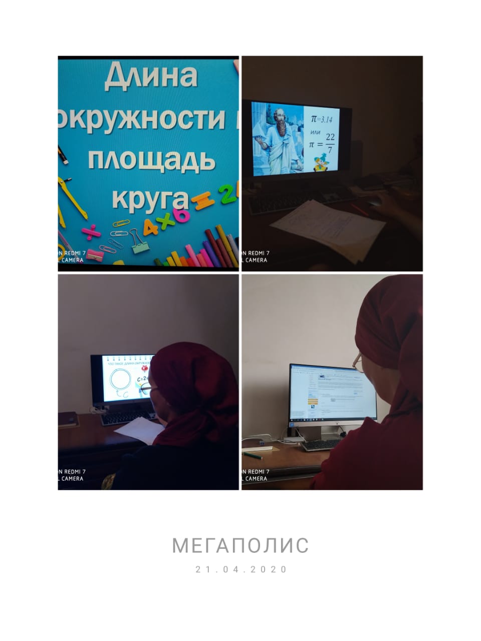 21.04.2020Сегодня, 21 апреля 2020 года, учитель математики Кочорова Светлана Николаевна провела урок в дистанционной форме в 6 классе по теме "Длина окружности и площадь круга".Ребята познакомились с формулами длины окружности, площади круга, с числом пи.