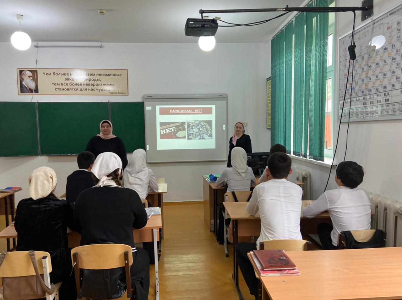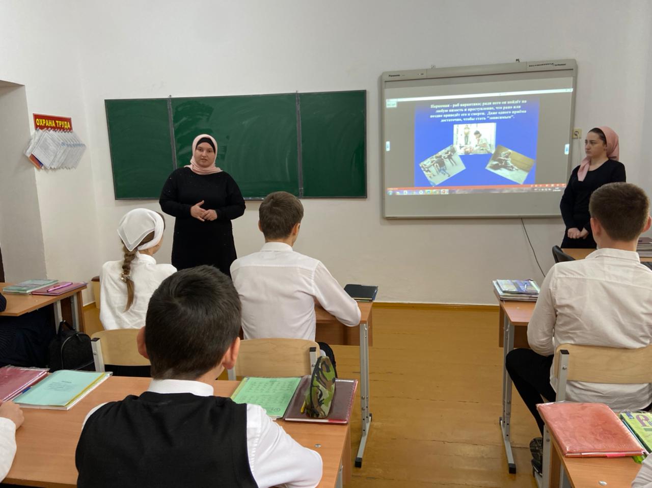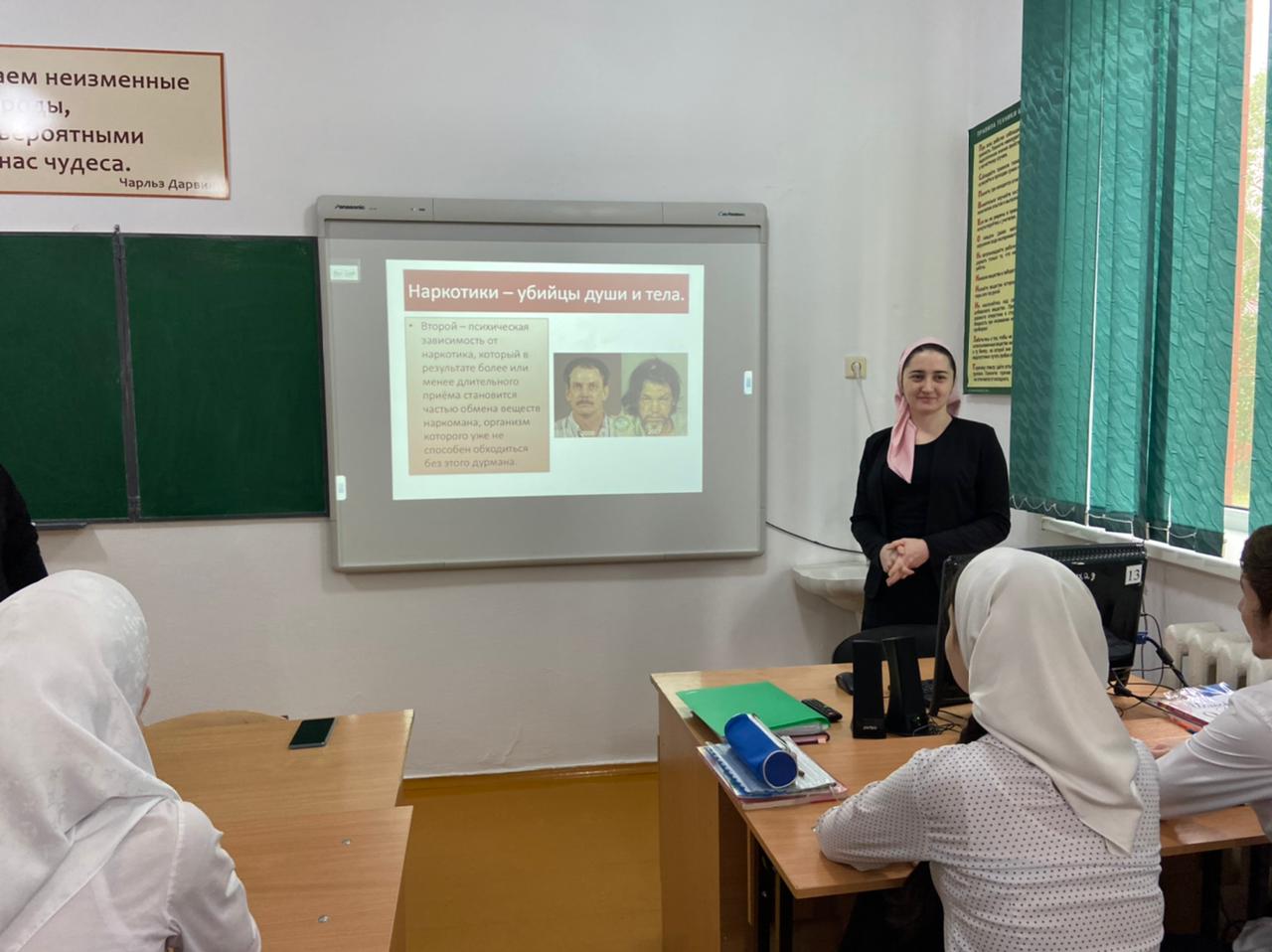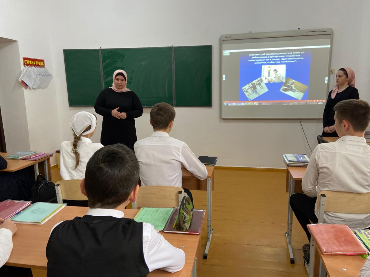 28.04.2021В МБОУ «Шелковская СОШ 2” в целях профилактики наркомании среди подростков социальным педагогом Мусаевой С.М и педагогом психологом Хадисовой М.Я. была проведена беседа на тему «Скажи «Нет!» наркотикам».