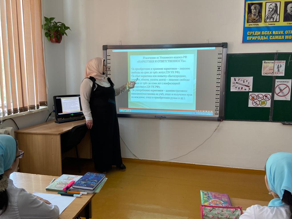 28.04.2021В МБОУ «Шелковская СОШ 2» педагогом психологом Хадисовой М.Я. была проведена беседа по теме «Нет наркотикам».
