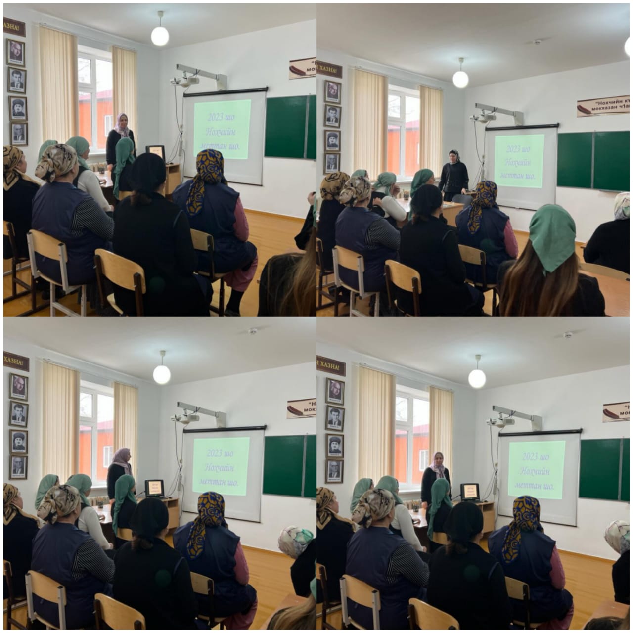 25.02.2023В МБОУ "Шелковская СОШ#2" прошло торжественное собрание трудового коллектива, посвященное году Чеченского языка, на котором заместитель директора по УВР Абумуслимова Х.Ш. ознакомила с планом мероприятий. 2023 год объявлен годом Чеченского языка. В целях сохранения, развития и популяризации чеченского языка, культуры и традиций чеченского народа.