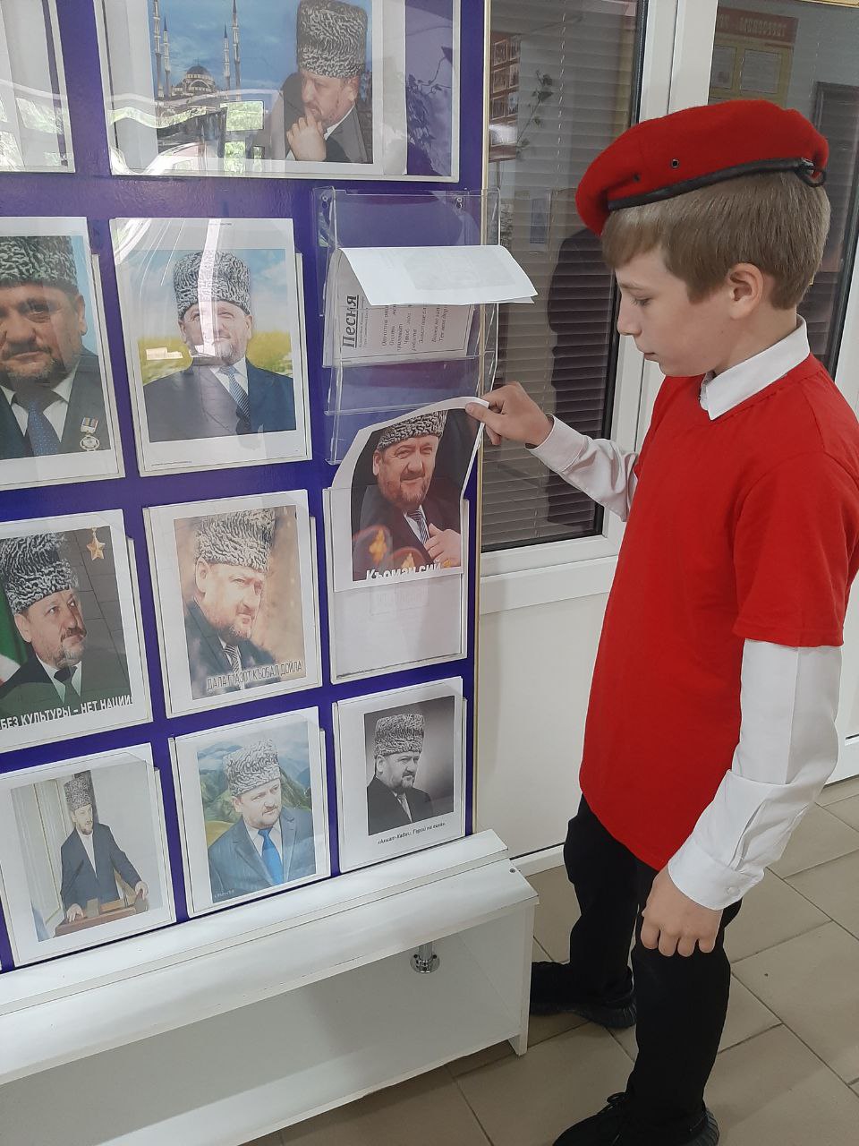 В соответствии с планом мероприятий, посвящённых "Дню памяти и скорби чеченского народа" Педагог-организатор Абдулвагапова З.И. вместе с активистами ЮнАрмии оформили выставку фотографий, посвящённая Первому президенту Чеченской Республики, Герою России А.А. Кадырову.