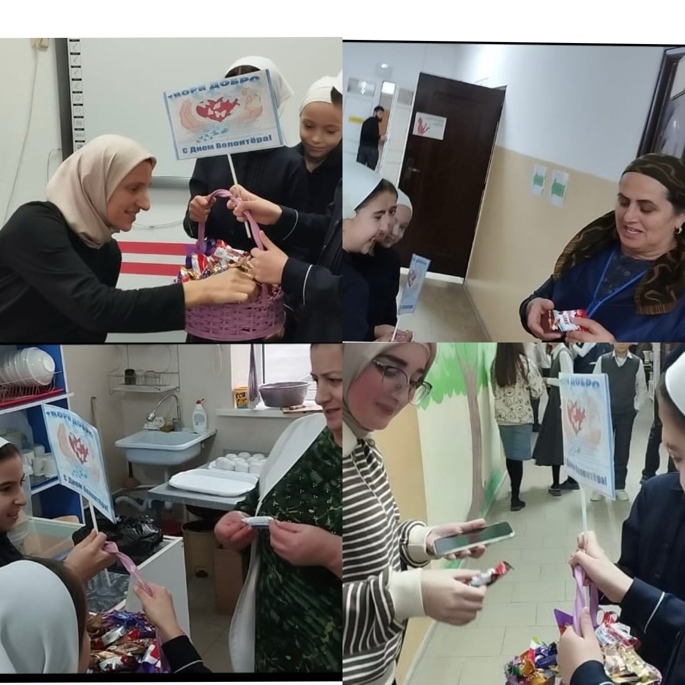 Волонтёрами становятся не только молодые, но и люди старшего поколения. В преддверии этой даты советник директора по воспитанию и взаимодействию с детскими общественными организациями Абдуразакова Джамиля Мавлюдовна совместно с классным руководителем 3 класса Делимхановой Луизой Исаевной и с ребятами приняли участие в акциях «Узелки добра», «Марафон культур» участвовали в классных встречах «Волонтёры о себе», помогли нуждающимся и сделали множество других добрых дел, которые они делают не только в «День добровольца».