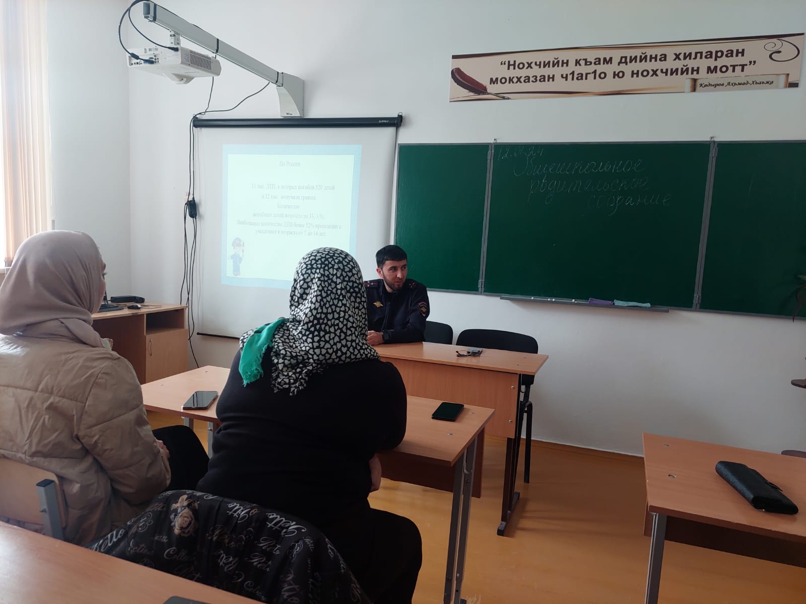 12.01.2024 года инспектор ОГБДД Шелковского района ЧР Солтаев Ш.Ш. выступил на общешкольном родительском собрании с разъяснением возможных правовых последствий за неисполнение обязанностей по содержанию и воспитанию детей, в целях предупреждения детского дорожно-транспортного травматизма.