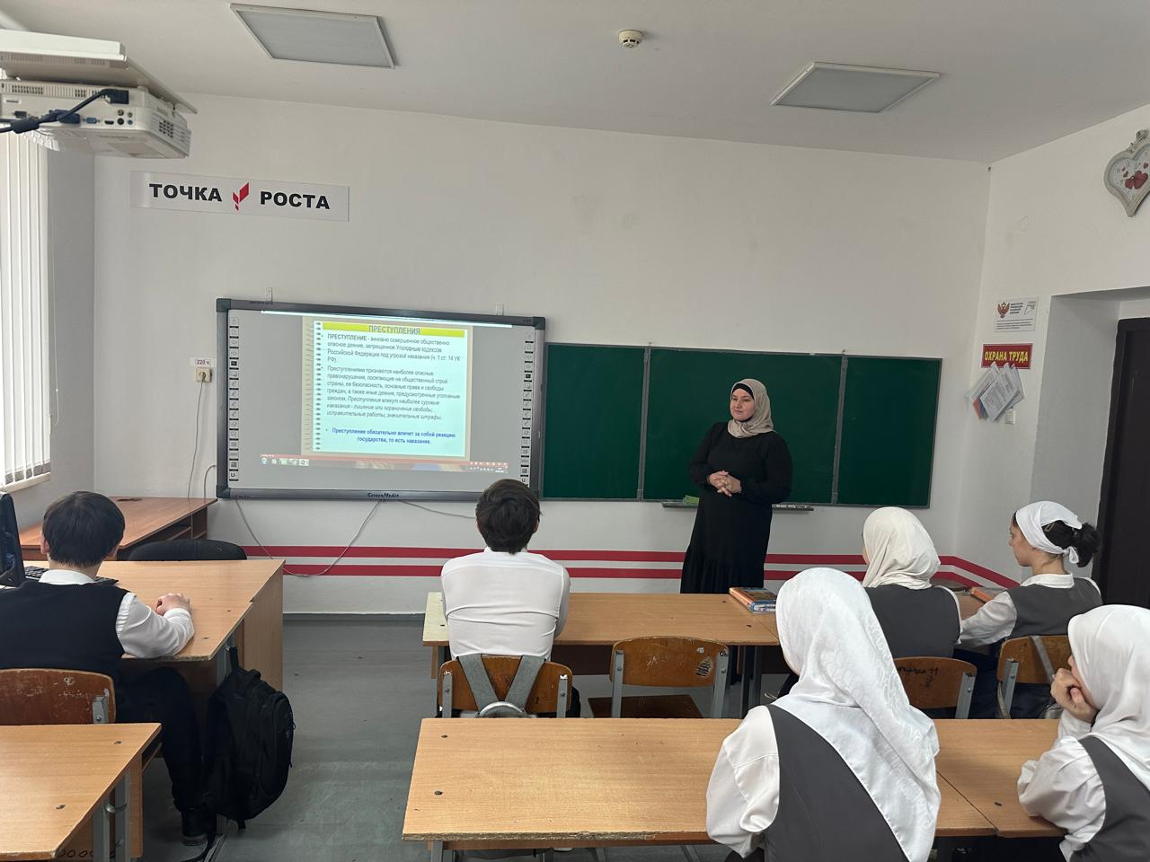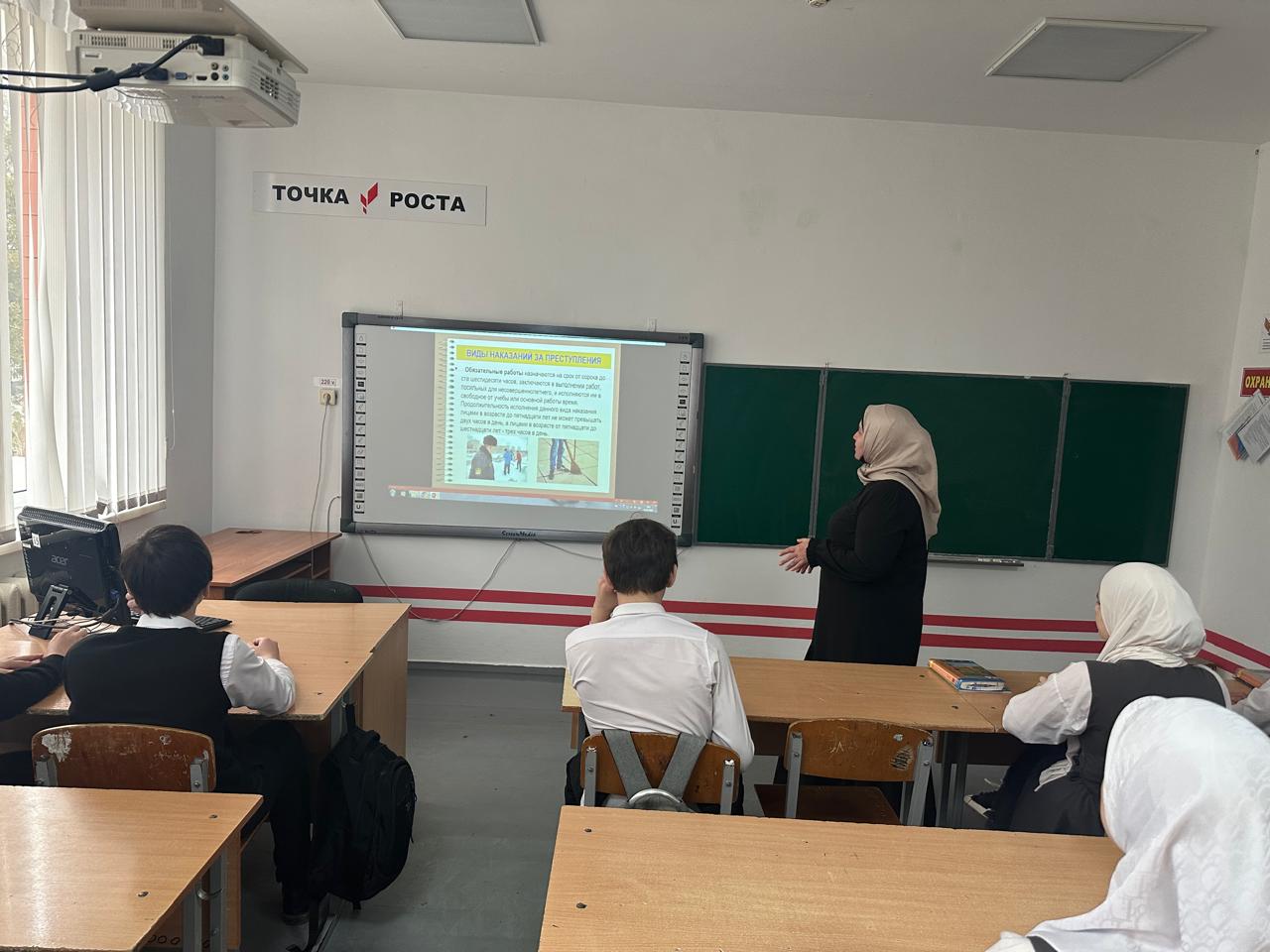 Во исполнении плана по профилактическим мероприятиям с детьми по результатам социально-психологического тестирования на 2023-2024 учебный педагог-психолог Халилова М.Я. провела беседу с учащимися по теме: «Уголовная ответственность несовершеннолетних».