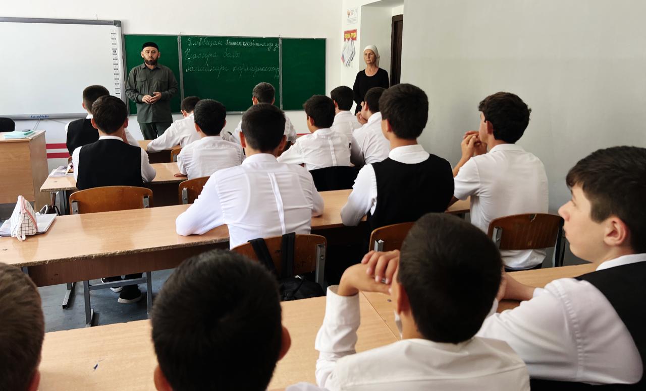 Беседа с мальчиками о поведении педагога-организатора ДНВиР. 13.09.2024 года в МБОУ "Шелковская СОШ №2" педагог -организатор ДНВиР Кусаев Н. М. провёл с мальчиками 7-9 классов беседу о поведении. Цель беседы: воспитание дружелюбия, ответственности за свои поступки. В ходе беседы Кусаев Н. М. объяснил ребятам, что нужно быть друг к другу добрее и терпимее.