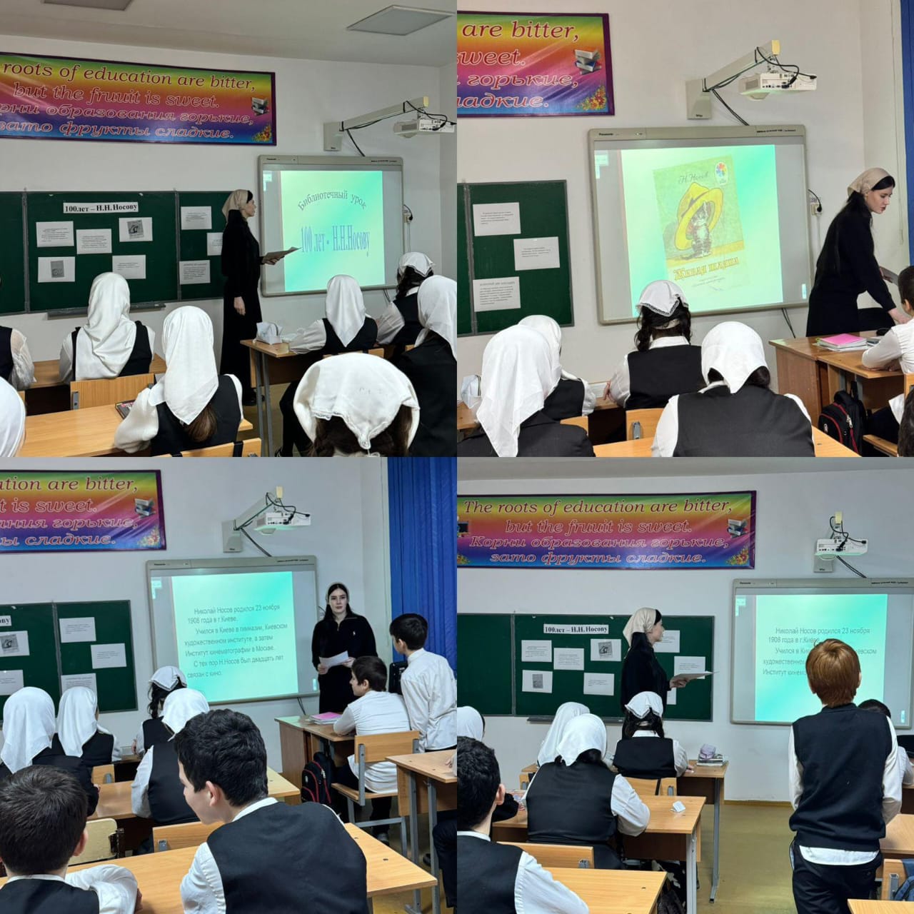 14 января 2025 года библиотекарь МБОУ "Шелковская СОШ№2" Торсаева М. Р. провела библиотечный урок в 5 классе "100 лет Н. Н. Носову".Цель мероприятия: создать условия для ознакомления с биографией и творчеством писателя и произведениями автора. Н. Н. Носов-детский писатель, автор рассказов и сказок " Живая шляпа", "Дневник Коли Синицына", " Приключения Незнайки".