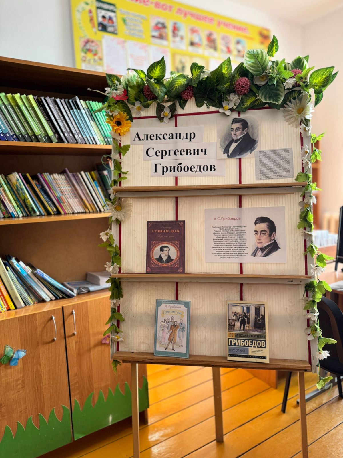 В целях популяризации чтения у обучающихся, библиотекарь школы Торсаева М. Р. 16.01.2025г.оформила выставку книг и печатного материала, посвящённую 230 лет со дня рождения русского писателя А. С. Грибоедова, автора книг "Горе от ума", " Студент", "О Кавказе и Персии. Путевые заметки, письма" и т. д.