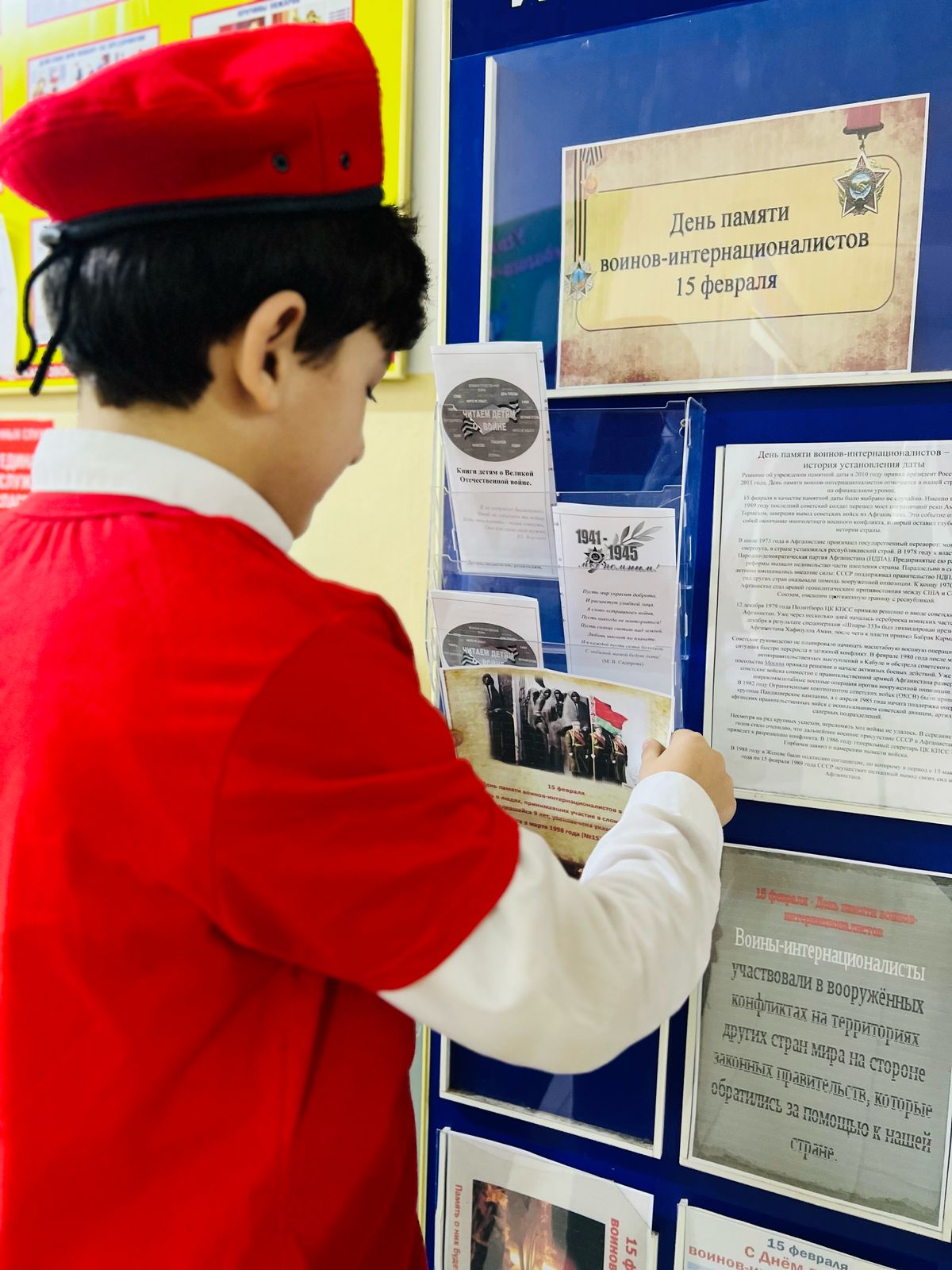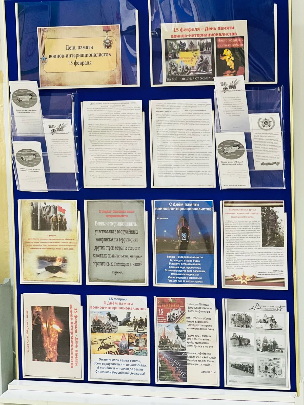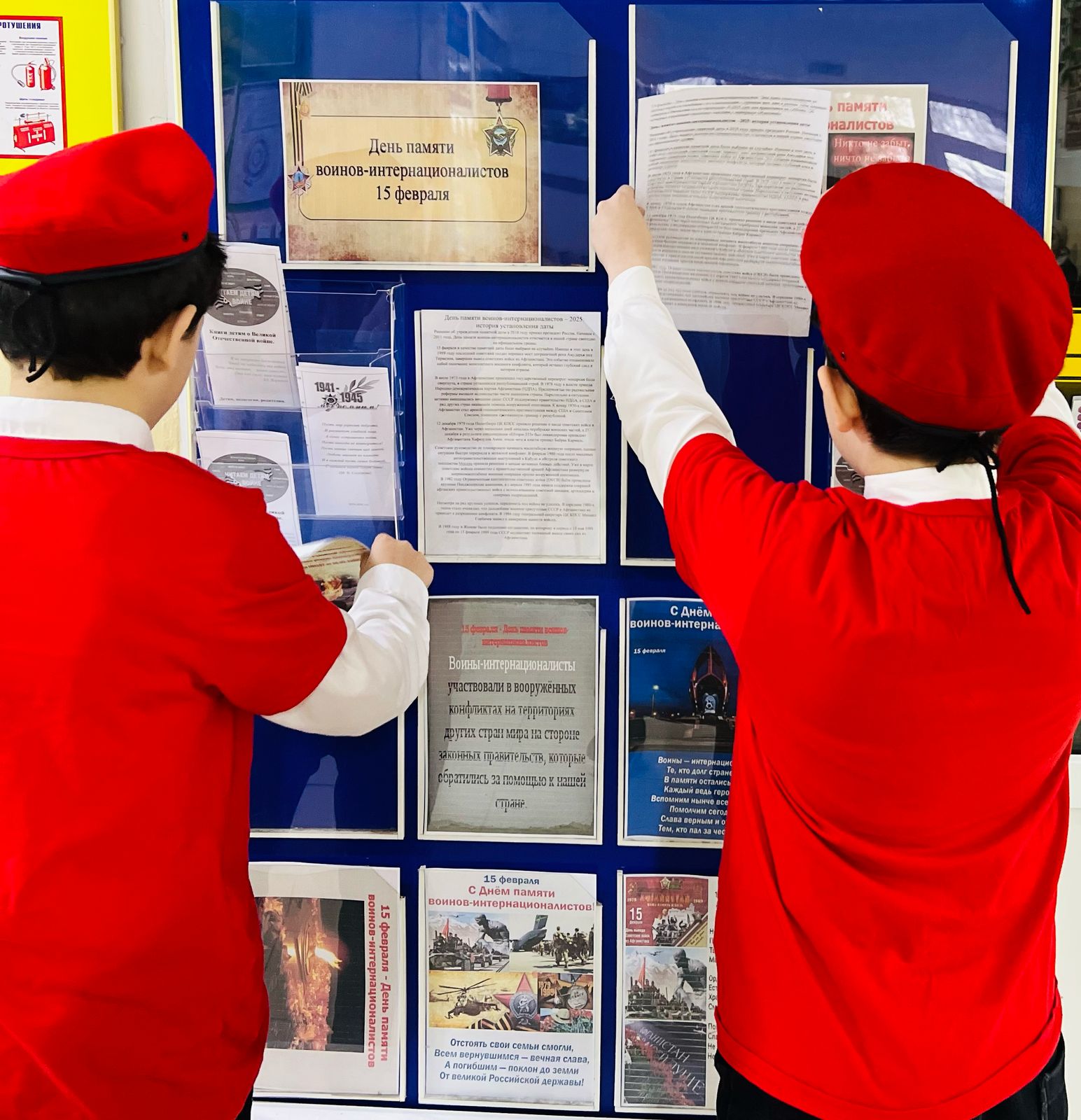 17.02.2025 Педагог-организатор МБОУ «Шелковская СОШ2» оформила стенд при помощи Юнармии ко дню памяти воинов интернационалистов.
