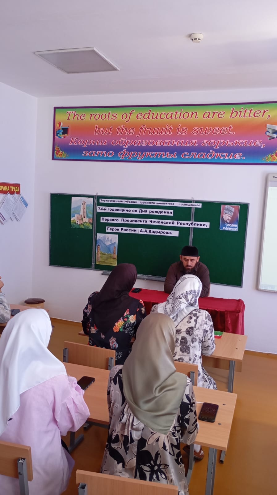 В соответствии с планом мероприятий посвященных 74-й годовщине со Дня рождения Первого Президента Чеченской Республики, Героя России А. А. Кадырова с 18 августа прошли следующие мероприятия: школа оформлена банером, прошёл конкурс чтецов посвящённых А-Х. Кадырову, ребята читали стихи чеченских писателей, все участники награждены грамотами. Прошло торжественное собрание трудового коллектива с имамом села Кусаевым Н. М., который провел беседу о жизни и деятельности А. А. Кадырова, педагог-организатор Акбулатова Л. М. провела акцию с учащимися.