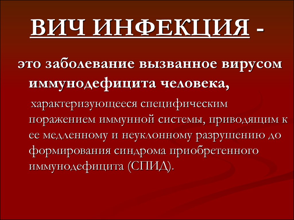 ВИЧ-инфе́кция — медленно прогрессирующее заболевание, вызываемое вирусом иммунодефицита человека (ВИЧ). Вирус поражает клетки иммунной системы, имеющие на своей поверхности рецепторы CD4: Т-хелперы, моноциты, макрофаги, клетки Лангерганса, дендритные клетки, клетки микроглии. В результате работа иммунной системы угнетается, развивается синдром приобретённого иммунного дефицита (СПИД), организм больного теряет возможность защищаться от инфекций и опухолей, возникают вторичные оппортунистические заболевания, которые не характерны для людей с нормальным иммунным статусом